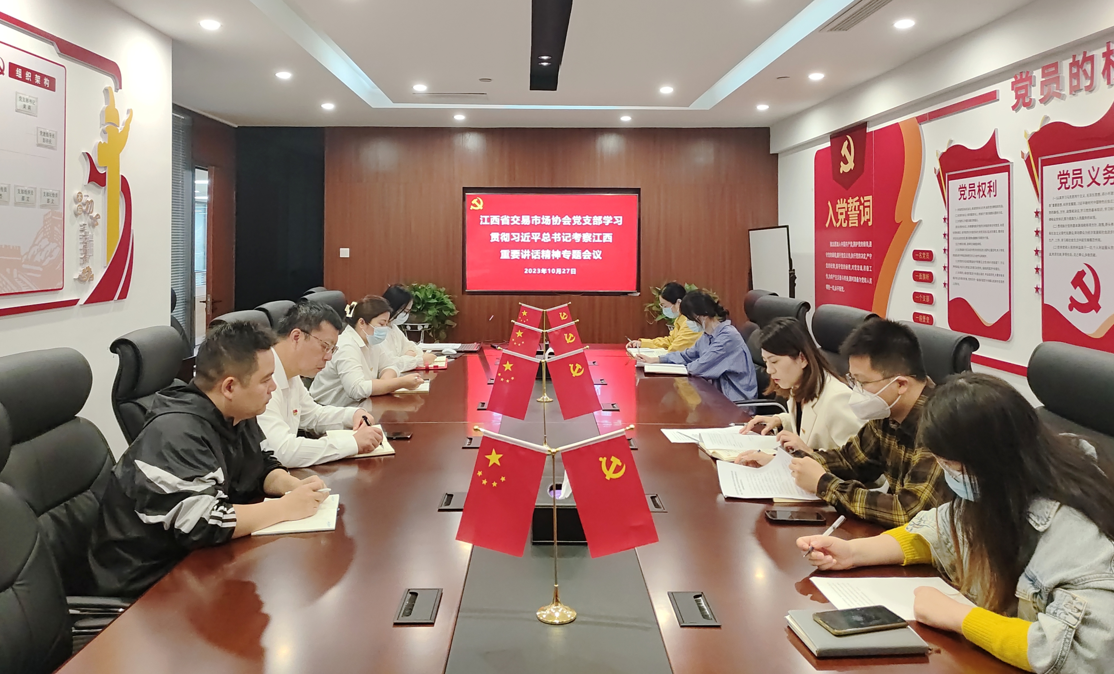 10月27日,江西省交易市場協會(huì)黨支部召開(kāi)學(xué)習貫徹習近平總書記考察江西重要講話精神專題會(huì)議,會(huì)議由支部書記黃莉主持,協會(huì)執行會(huì)長(cháng)、省聯交運公司董事(shì)、總經(jīng)理劉祖國(guó)同志出席會(huì)議,支部全體黨員(含預備黨員)、發(fā)展對(duì)象、入黨積極分子一同參會(huì)。