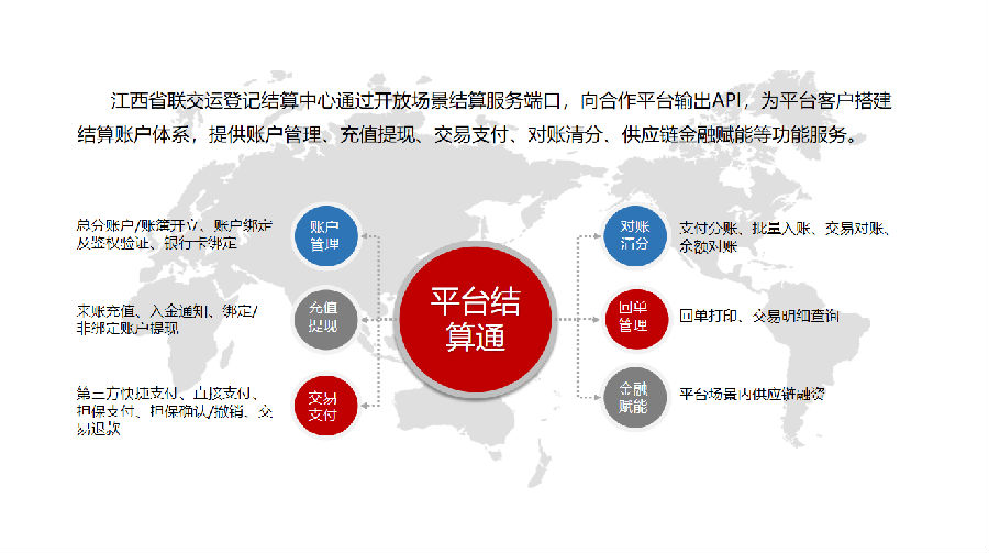 平台結算通是公司沉心運營8年多來,不斷優化升級集中登記結算管理服務的各項功能(néng)體驗和各類場景服務輸出,重點建設打造的爲地方交易場所及多類型垂直行業/業務場景提供全鏈路交易資金“收+管+付”的綜合服務解決方案。平台結算通可滿足地方交易場所及各類B2B、B2C交易平台的資金存管、實時(shí)結算、賬戶管理等共性需求,包括但不限于提供總分賬簿開(kāi)立、多渠道(dào)充值提現、擔保交易支付、批量對(duì)賬清分、回單打印查詢、供應鏈金融賦能(néng)等一體化資金結算和賬戶管理服務。