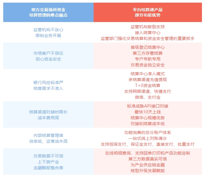 平台結算通目前已成(chéng)功對(duì)接服務多家地方交易場所、醫藥購銷平台、網絡貨運平台及産業電商平台等,有效幫助解決相關交易平台資金結算管理等難點痛點問題。以地方交易場所行業爲例:受監管政策趨嚴并行業發(fā)展良莠不齊等多重因素影響,近年來地方交易場所行業一直處于規範調整中,如何讓監管部門提振行業發(fā)展信心、讓客戶放心安心交易成(chéng)爲各類交易平台的痛點難點問題。公司推出的平台結算通産品在多方面(miàn)解決了以下諸多問題,在助力地方交易場所行業轉型升級健康發(fā)展等方面(miàn)發(fā)揮了重要作用。