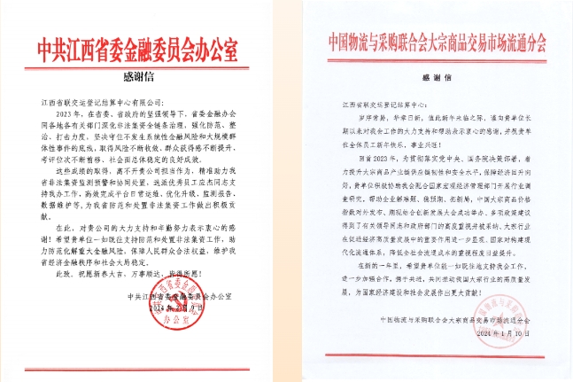 新春前夕,江西聯交運先後(hòu)收到來自中國(guó)物流與采購聯合會(huì)大宗商品交易市場流通分會(huì)和中共江西省委金融委員會(huì)辦公室發(fā)來的感謝信,分别對(duì)公司長(cháng)期以來服務并推動大宗行業高質量發(fā)展及擔當作爲、精準助力爲我省防範和處置非法集資工作做出的積極貢獻表示表達充分肯定和感謝。