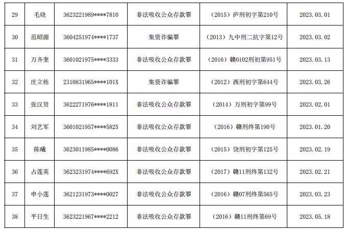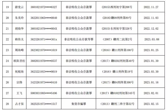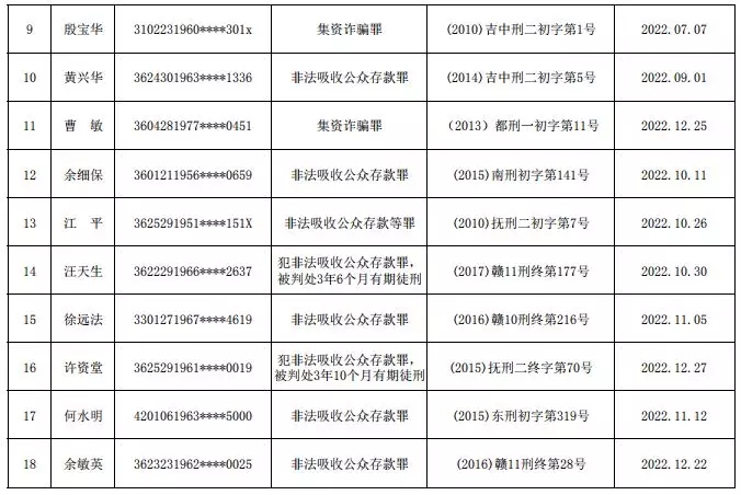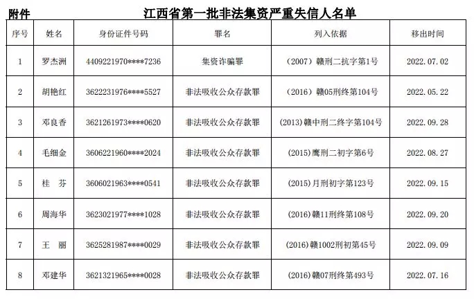 爲加強社會(huì)信用體系建設,加大對(duì)非法集資嚴重失信人的聯合懲戒力度,省打擊和處置非法集資工作領導小組辦公室公布了第一批45名非法集資嚴重失信人名單。此次公布的非法集資嚴重失信人名單,包括以非法吸收公衆存款罪、集資詐騙罪等罪名被人民法院生效判決判處監禁刑的自然人。