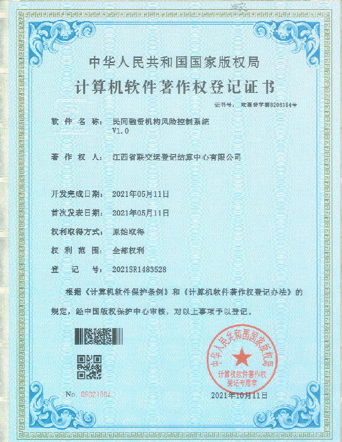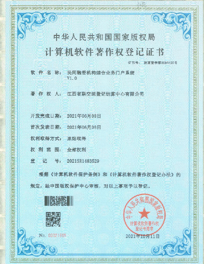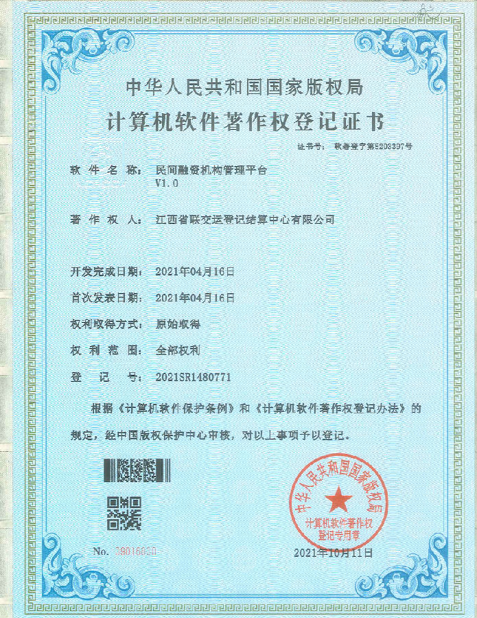 10月11日,由江西聯交運建設運營的江西省民間融資機構資金統一存管與結算系統成(chéng)功獲得由國(guó)家版權局頒發(fā)的3項計算機軟件著作權登記證書;