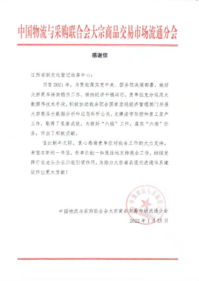 新春佳節來臨之際,江西聯交運連續收獲兩(liǎng)封來自江西省防範和處置非法集資工作領導小組辦公室和中國(guó)物流與采購聯合會(huì)大宗商品交易市場流通分會(huì)的《感謝信》,分别對(duì)公司長(cháng)期以來助力我省防範和處置非法集資工作,保障地方金融穩定以及協助維護大宗商品産業鏈供應鏈穩定,促進(jìn)實體經(jīng)濟高質量發(fā)展等方面(miàn)作出的積極貢獻表達肯定和真誠感謝。