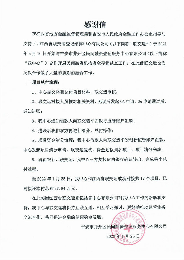 近日,江西省聯交運登記結算中心有限公司(以下簡稱“江西聯交運”)收到兩(liǎng)封來自中國(guó)物流與采購聯合會(huì)大宗商品交易市場流通分會(huì)和吉安市井開(kāi)區民間融資登記服務中心有限公司的感謝信,分别對(duì)江西聯交運在促進(jìn)大宗商品實體經(jīng)濟發(fā)展和協助地方金融機構合規、健康、良性發(fā)展等方面(miàn)作出的積極貢獻表達真誠感謝。